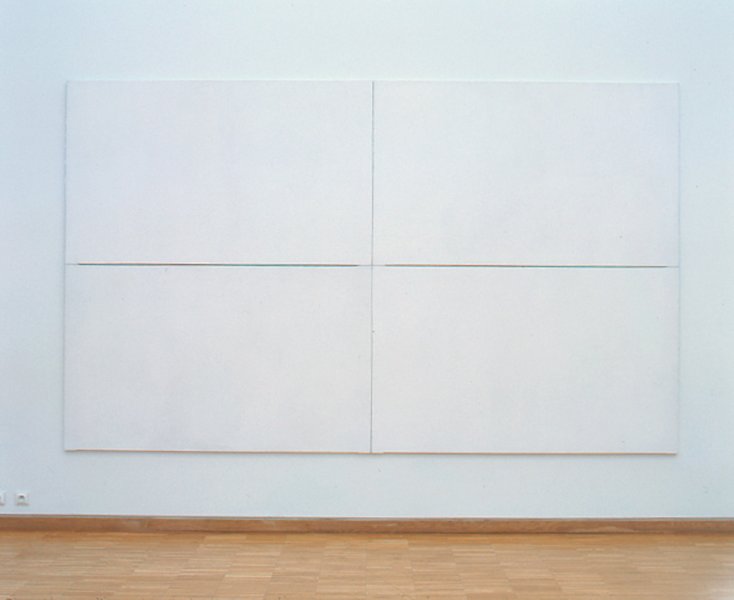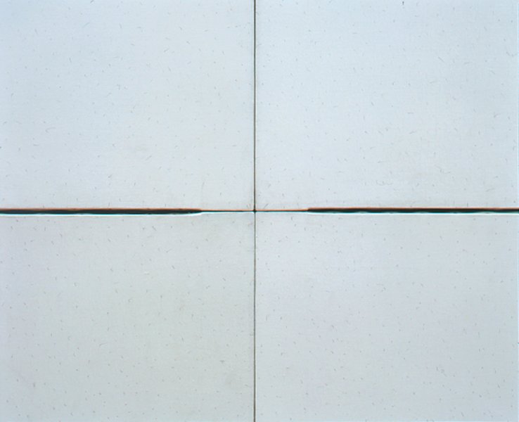 Four untouched canvases compose an impressive polyptych. Untouched, really? At closer look, the neutral surface reveals numerous small pencil traces. These irregular speckles form an imperceptible grid, a discreet rhythm in the space of the canvas and of the gaze.