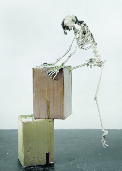 If the work Violent Capuccino is surprising by name, the installation itself is no less striking. Two cardboard boxes stand one on top of the other; a dust-covered skeleton struggles to get in or out.