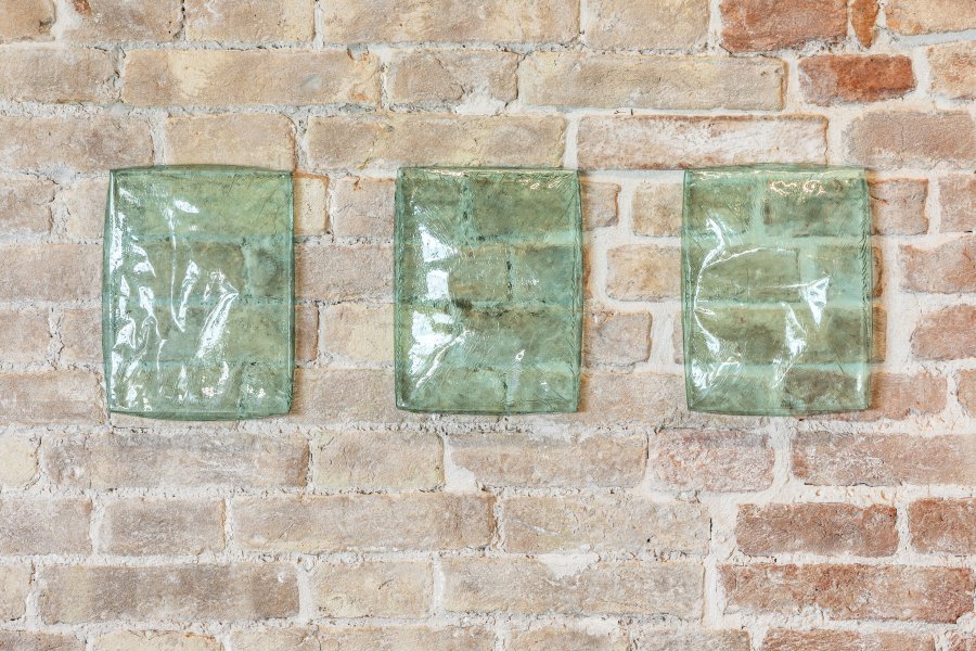Edith Dekyndt's work is about space in all its dimensions - sound, light, temperature - revealing what is normally imperceptible because it is ephemeral. The painting then becomes a place for a process of seizure, capturing these changes. The triptych retains only an apparent, transparent memory of the monochrome paint, like frozen organic membranes.