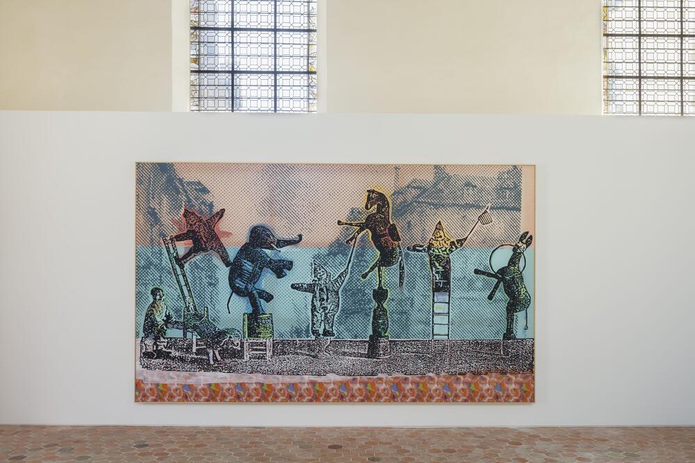 Spécifiquement conçue pour le Palazzo par Elena Geuna et Guy Tosatto en collaboration étroite avec The Estate of Sigmar Polke, l’exposition rassemblait sur la totalité de ses espaces près de quatre-vingt-dix œuvres en provenance de la Collection Pinault ainsi que de grandes collections publiques et privées européennes. Elle entendait à la fois couvrir la carrière prolixe de l’artiste dans son ensemble exprimée à rebours, de la fin des années 2000 au début des années 1960, et toute la diversité des media artistiques qu’il éprouva (peinture, dessin, installation, film…), évocation de son projet d’œuvre d’art total que fut le pavillon allemand de la Biennale de 1986. Parmi les différentes facettes de sa pratique artistique donnant la part belle à l’expérimentation, deux s’affirmaient comme de grands axes autour desquels s’articulait le parcours d’exposition : à savoir la dimension politique et la dimension alchimique de son art. Cette dernière était notamment incarnée dans le chef-d’œuvre Axial Age qui introduisait l’exposition, groupe monumental de sept tableaux réalisé pour la Biennale de 2007 et présenté pour la première fois dans l’atrium de Palazzo Grassi.