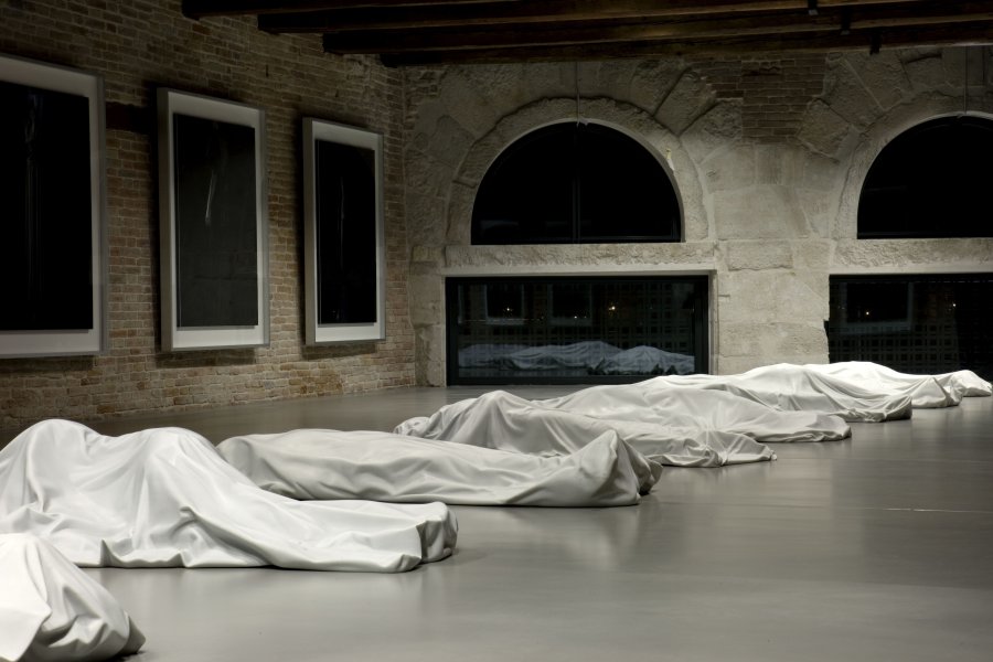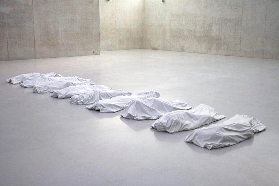 Neuf corps étendus, alignés. Neuf morts. Neuf cadavres dont l’identité est inconnue et l’histoire incertaine. S’agit-il de charognes oubliées et retrouvées, recouvertes négligemment par un voile, dans l’attente d’un meilleur sort ? D’êtres assassinés qu’un drap policier dérobe pudiquement au regard ? Difficile de connaître la nature de ces êtres que le dessin d’un pied, la virgule d’une épaule et la saillie d’un genou permettent de deviner humains. Moins la rigueur du marbre, donc, que la rigidité cadavérique. Charnier anonyme ou tuerie sauvage que cette vision de Maurizio Cattelan, qui se distingue par son eurythmie comme par sa richesse – par sa disposition comme par sa conformation, aucun corps ne ressemble à un autre. Ici l’imagination supplée l’observation : que voit-on réellement ? Que discerne-t-on vraiment sous ces voiles étranges, sous ces gazes mystérieuses ? Quels papillons morts sous ces troublantes chrysalides ?