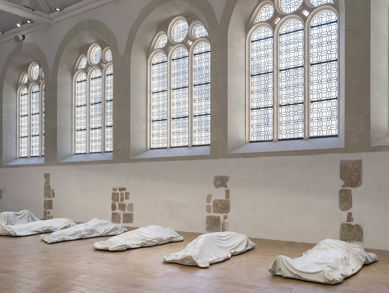 L’utilisation du marbre de Carrare n’est pas anodine. Recourant à un tel matériau, originairement précieux, symboliquement saturé, Cattelan parvient, ainsi qu’il aime depuis toujours à le faire, à déjouer la tradition et à jouer avec les références. À cet égard, ces neuf linceuls énigmatiques ne sauraient être indifférents à certaines œuvres majeures de l’histoire de l’art, que l’on songe à la Lamentation sur le Christ mort (vers 1480) de Mantegna et au Martyre de sainte Cécile (vers 1600) de Stefano Maderno à Sainte-Cécile-du-Trastevere de Rome, une peinture sculpturale et une sculpture baroque emblématiques de l’illusionnisme transalpin. Ici le trivial rejoint le divin, le macchabée le gisant, le drap le drapé et la scène de crime la nef de l’église. Nul indice ne permet d’élucider cette vision sacrée et virtuose, dont le regardeur peine à savoir si elle est issue d’un cimetière, d’une crypte, d’une morgue ou d’un trottoir.