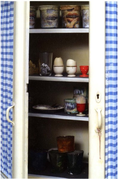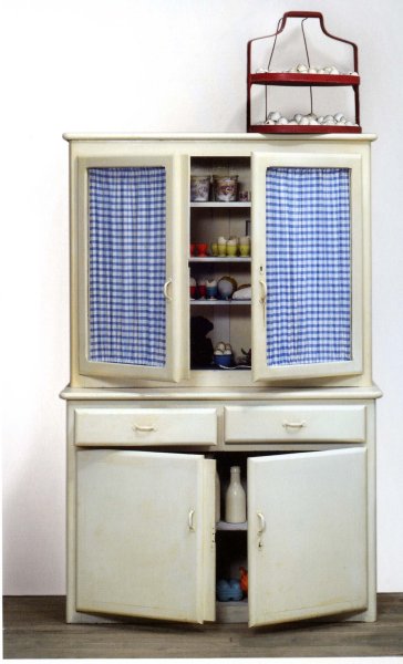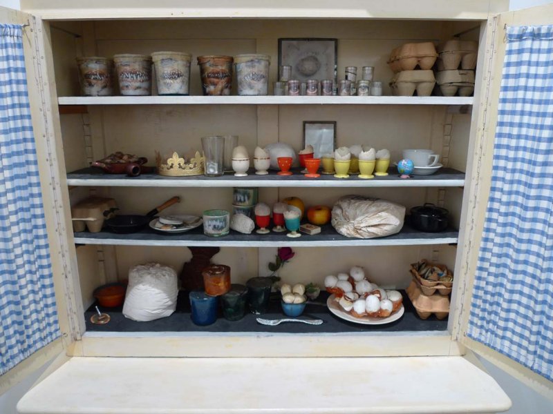 Une ancienne armoire de cuisine blanche aux rideaux bleus laisse apparaître entre ses portes entrouvertes des ustensiles de cuisine et des œufs. En coquetiers, en boîte ou dans des plats, à l’intérieur du meuble ou à l’extérieur, les coquilles sont omniprésentes. Construite comme un cabinet de curiosités familier, Armoire de cuisine illustre le travail sarcastique et subversif de Marcel Broodthaers, questionnant dans ce ready-made le statut d’œuvre d'art.