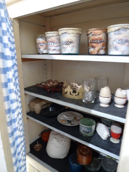 Armoire en bois peint, remplie d'objets divers ; panier en fer peint, rempli de coquilles d'œuf