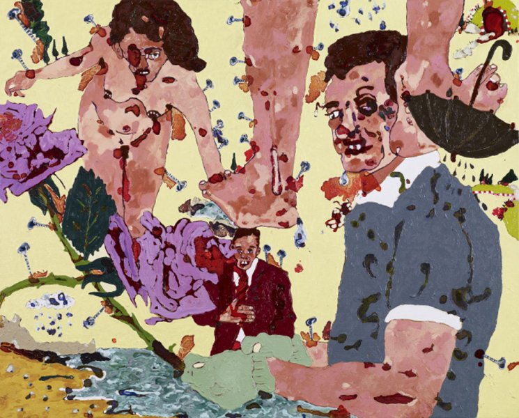 Sur un fond marin, un corps de femme nu est meurtri par des dizaines de clous qui envahissent la toile. Un homme, dont le visage est déformé par les plaies, tient une rose épineuse géante. D’autres éléments incongrus comme un parapluie viennent renforcer le caractère à la fois douloureux et énigmatique de ce tableau de Philippe Perrot.