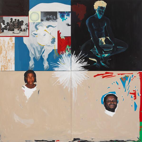 La série des Atom Paintings est constituée de quatre toiles, elles-mêmes divisées en quatre espaces, accueillant chacun des réalités multiples. Le regard, invité au centre, ne cesse ensuite de fuir de l’une à l’autre partie, sans pouvoir se fixer réellement. L’artiste questionne ainsi l’immobilité et l’unicité de l’identité, et le rôle qu’a pu jouer la représentation artistique dans l’objectification des corps féminins, noirs et queers. Ainsi Kudzanai-Violet Hwami retranscrit les infinies possibilités de l’être, autant que la vie du Zimbabwe contemporain.