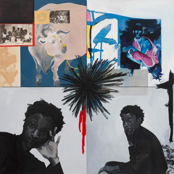 La série des Atom Paintings est constituée de quatre toiles, elles-mêmes divisées en quatre espaces, accueillant chacun des réalités multiples. Le regard, invité au centre, ne cesse ensuite de fuir de l’une à l’autre partie, sans pouvoir se fixer réellement. L’artiste questionne ainsi l’immobilité et l’unicité de l’identité, et le rôle qu’a pu jouer la représentation artistique dans l’objectification des corps féminins, noirs et queers. Ainsi Kudzanai-Violet Hwami retranscrit les infinies possibilités de l’être, autant que la vie du Zimbabwe contemporain.