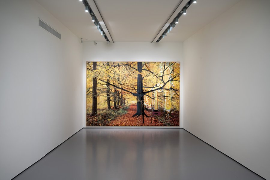 L’immense diptyque Bäume nous projette dans la quiétude d’une clairière aux vives couleurs automnales. Simple reproduction photographique surdimensionnée en apparence, l’œuvre est en réalité maculée de peinture sur l’un de ses deux panneaux. Tandis que des aplats de blanc aux spirales jaune-oranges tendent à se fondre harmonieusement dans le décor naturel, des coulures blanches, des taches noires et violettes qui se superposent au niveau du sol ou encore les rehauts sombres sur le tronc de l’arbre au centre de la composition trahissent une présence picturale.