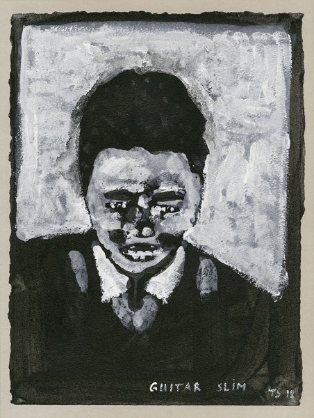 Blues Men est une série de sept peintures représentant autant de figures majeures de la musique noire américaine : Muddy Waters, Jimmy Reed, Mississippi John Hurt, B.B. King, Guitar Slim, Bukka White et Elmore James. L'artiste allemand Thomas Schütte les débarrasse de tous les accessoires (on aurait pu attendre à une représentation de leurs instruments) pour se concentrer uniquement sur le visage de chaque musicien dont il livre un portrait attentif.
