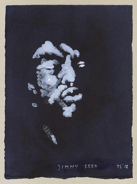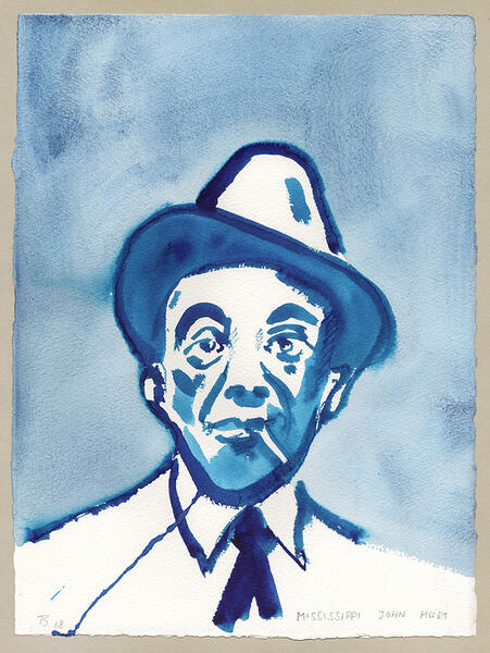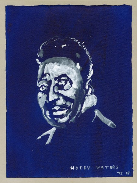Composés par traits rapides, accompagnés par des notes de noir et de blanc, qui se découpent sur un fond bleu uni et profond à l'aquarelle, ces portraits s'imprègnent avec force dans le papier fait main. Chaque figure est animée d'une émotion bien distincte, renvoyant à la sentimentalité du blues, tout comme elle entérine une régularité de la représentation : les peintures s'appuient en effet sur des photographies très célèbres des musiciens. Ici, Thomas Schütte navigue entre citation pop de la culture mondiale et exploration d'un héritage partagé. Le blues des musiciens américains est aussi le bleu des romantiques allemands : c'est la couleur de la mélancolie, de l'angoisse, et du sentiment d'inadéquation au monde contemporain.