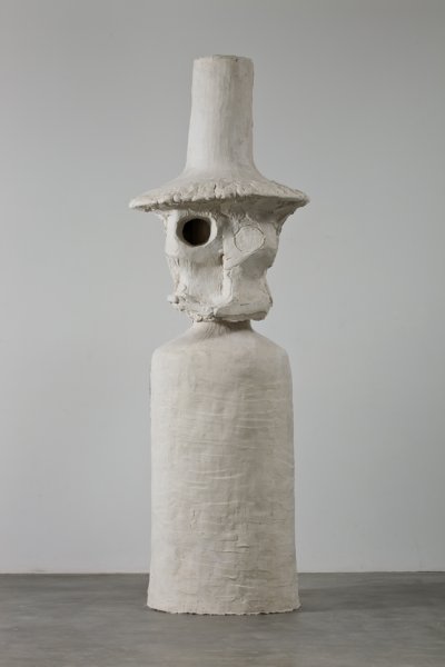 Un crâne, ou un masque, apparaît au milieu d’une bouteille. Créature hybride et monumentale, Bottle II frappe d’emblée par sa robustesse. Mais une fois cette première impression passée et le dialogue avec la sculpture instauré, l’on s’aperçoit de sa fragilité, voire de son caractère dérisoire. Inachevée, couturée, elle exhibe ses traces de modelage et d’assemblage comme des failles.