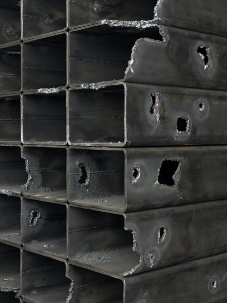 Le terme arabe bourj désigne une tour ou un grand édifice. Partant de cette notion, l’artiste plasticienne d’origine palestinienne Mona Hatoum élabore une installation minimaliste exclusivement constituée de poutres d’acier simplement empilées pour gagner de la hauteur. Seul un examen approfondi de l’œuvre permet de distinguer en surface des traces de perforations, de coupures et de brûlures.