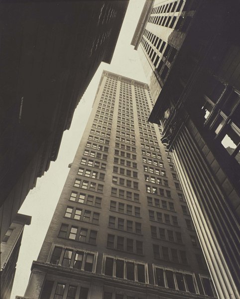 Comme saturée, la composition vertigineuse de Canyon, Broadway and Exchange Place, Manhattan, 1936 ne laisse quasiment plus de place pour la clarté du ciel, obstrué par la masse sombre et oppressante de trois gratte-ciels vus en contre-plongée.