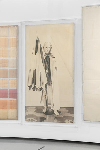 C’est par ces mots que l’artiste Giulio Paolini décrit en 1969 son œuvre Delfo II, dont la dimension symbolique et éthérée n’est pas sans rappeler les compositions métaphysiques de Giorgio de Chirico. Dans cette œuvre à taille réelle, l’artiste met en scène sa propre disparition, son visage se voyant substitué par un marbre classique aux traits immortels. Y transparaissent également ses préoccupations personnelles, à commencer par le rapport entre l’artiste et son œuvre ainsi que l’illusion perceptive, confondant ici dessin, peinture et réalisme photographique.