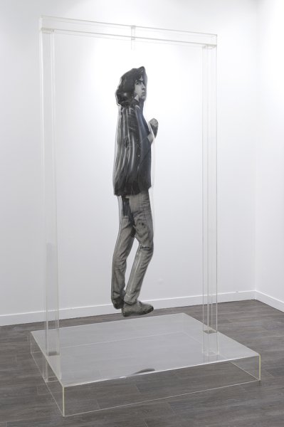 L’œuvre Delincuente témoigne de cette approche originale. Sur la première face de l’œuvre se trouve une photographie d’un homme prise sur le vif. Flottant dans les airs, il apparaît, disparaît et laisse se refléter notre image dans le miroir présent sur l’autre face. L’artiste travaille avec des figures prises sur le vif, figées dans leur solitude. La cage de plexiglas qui les emprisonne peut s’apparenter à une chrysalide leur permettant de renaître dans ce monde violent.