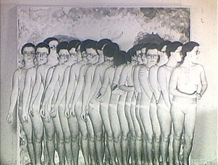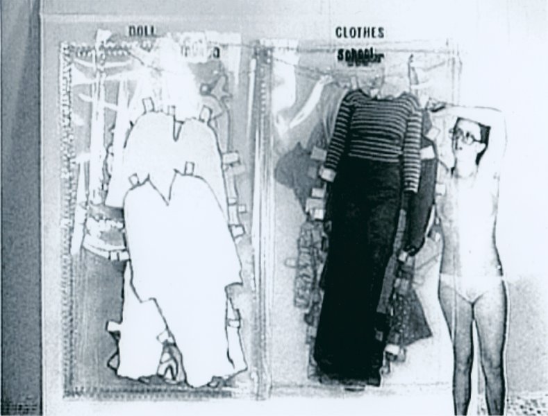 Court film muet en noir et blanc, Doll Clothes renseigne les tribulations vestimentaires d’une photographie découpée et animée représentant l’artiste elle-même. Cindy Sherman apparaît d’abord nue, se pare d’habits et se mire dans une glace, jusqu’à ce que deux mains la dénudent à nouveau. La vidéo se clôt sur l’expression frustrée sur le visage de la jeune femme et la fermeture du livre aux ornements fleuris dans lequel l’action prend place.