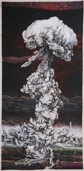 La peinture à l’encre sur soie E = mc² au-dessus de Nagasaki de Yang Jiechang produit d’abord un véritable choc visuel. Avec une maîtrise technique incontestable, l’artiste évoque frontalement la bombe atomique américaine sur le Japon en 1945, véritable traumatisme pour le pays. Le nuage de fumée, forme chaotique et fascinante, nous interroge sur l’éphémère, la transformation, le lien entre ciel et terre, et la place de l’homme.