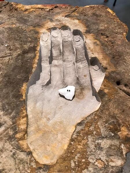 Sur un tronc d’arbre pétrifié, l’empreinte de la main droite de Giuseppe Penone tient en son sein deux grains de sable parfaitement identiques. Mais cette similarité est contre-nature, puisque chaque grain a une forme unique : ainsi dupliqué, ce grain de sable semble matérialiser l’impact de l’être humain sur la nature.