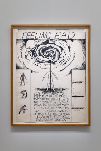 Feeling Bad, œuvre de jeunesse de Mike Kelley, encore étudiant au California Institut of the Arts, définit l'essence de la force créatrice, en adressant cette question sous la forme d'un vortex indéterminé qui traverse un corps. On peut percevoir dans le haut de l’œuvre des motifs tourbillonnants, une tornade chaotique qui est absorbée par la figure de l’artiste, axe central tel l’Homme de Vitruve de Leonard de Vinci.. Sur le côté sont décrites différentes phases de la création : se tenir droit, se plier (et vomir), s’asseoir (et déféquer), s’allonger, être rabaisser, devenir poussière.