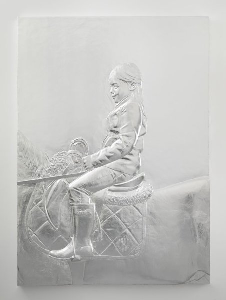 Girl on Pony représente une jeune fille – en l’occurrence, la filleule de l’artiste – chevauchant son poney, qui demeure pour l’essentiel hors cadre. Si l’image semble se dérouler dans le monde contemporain – en attestent les vêtements et les accessoires de la cavalière –, la forme prise par la figuration renvoie à une époque beaucoup plus éloignée : le profil strict du personnage et la technique du bas-relief rappellent les tombeaux égyptiens, les frises des temples et le flanc des sarcophages grecs. Ce va-et-vient temporel est accentué par l’irisation que provoque l’aluminium.