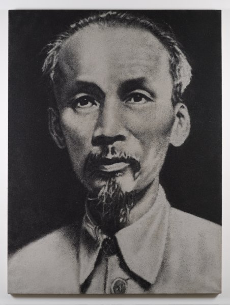 Ce portrait en noir et blanc d’Ho Chi Minh, grand artisan de l'indépendance du Viêt Nam du Nord a été peint avec une technique singulière à base de cendres d'encens, de fusain et de résine, développée par Zhang Huan en 2007.