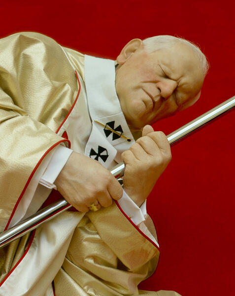 Présentée sur une moquette rouge vif, La Nona Ora, célèbre sculpture de l’artiste italien Maurizio Cattelan, conservée au sein de la Collection Pinault, représente le pape Jean-Paul II terrassé par une météorite. Le titre fait écho à l’histoire du Christ qui, à « la neuvième heure » de son calvaire, s’écrie ainsi : « Mon Dieu, mon Dieu, pourquoi m’as-tu abandonné ? » L’artiste interroge alors, à travers une mise en scène au réalisme saisissant, le pouvoir de la religion sur la mort.