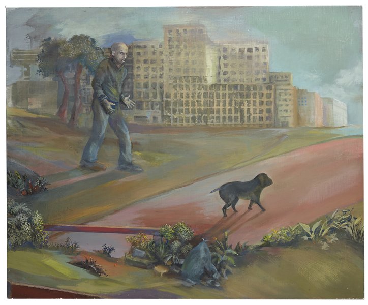 Dans un décor périurbain aux allures de terrain vague, un homme essaie d’interagir avec un petit chien noir, lequel semble faire peu de cas de l’individu. L’animal se dirige, décidé, dans le sens opposé, vers un lointain paysage qui nous est invisible. Cette attitude provoque l’énervement de l’homme qui exprime sa frustration dans un mouvement universel, les mains ouvertes et paumes vers le ciel.