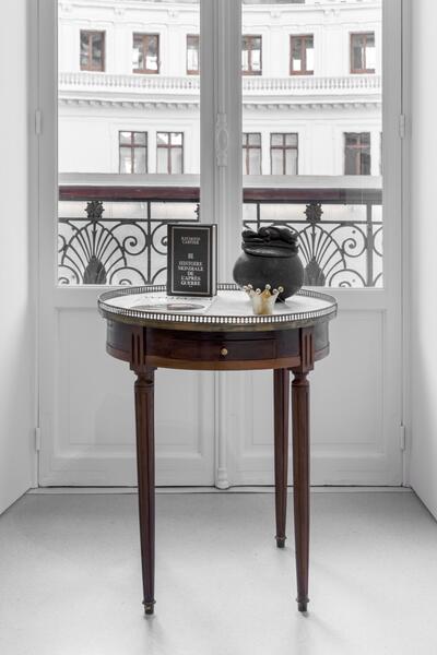 Sur une table dite « bouillotte », utilisée pour le jeu sous le règne de Louis XVI, repose un assemblage inscrit dans le vocabulaire artistique de George Adéagbo.