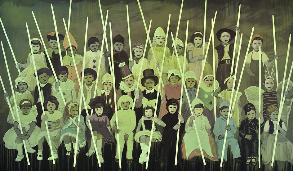 Peints frontalement sur une toile monumentale, des enfants se tiennent en rang à la manière d’une photographie de classe. L’apparente innocence de la scène camoufle néanmoins une énigme. Déguisés comme pour le Mardi gras, les enfants sont munis de lances phosphorescentes dressées vers le ciel. Pareils à des figures fantomatiques, ils semblent se fondre dans un autre espace-temps depuis lequel ils scrutent le spectateur.