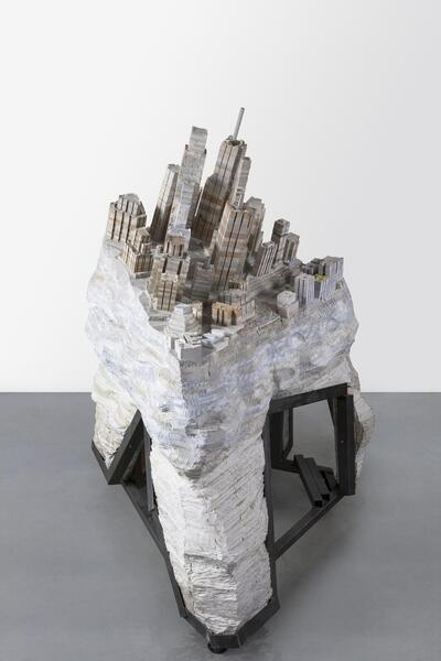 Library III (2012), est une installation composée de villes sculptées dans des livres compressés, portées par des structures métalliques à roulettes. Au bord de l’écroulement, ces maquettes taillées dans des piles d’ouvrages, supports de connaissance détournés de leur fonction première, créent des paysages urbains vacillants. Liu Wei livre une réflexion sur le chaos du monde, les systèmes et mécanismes de pouvoir qui sont au coeur des grandes métamorphoses sociétales.