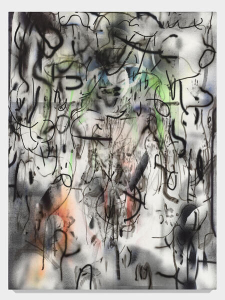 Pour Maahes (Mihos) torch, l’artiste américaine d’origine éthiopienne Julie Mehretu poursuit le processus de travail qu’elle expérimente depuis le milieu des années 2010 : à partir d’une photographie de presse floutée et recadrée qu’elle transfère sur la toile, l’artiste ajoute un réseau complexe de marques graphiques à l’aide de divers outils et procédés : tramage numérique, pinceau à l’encre et à l’acrylique, pistolet à peinture, pochoirs...