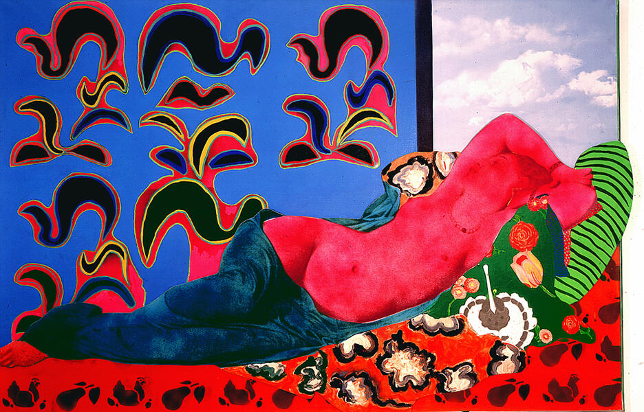 Surdimensionnée et profondément revisitée, il ne reste de l’œuvre originale que la figure féminine centrale, révélant le caractère obsessionnel du travail de Martial Raysse au début des années 1960. Alors fasciné par les stéréotypes féminins modernes et classiques, il dédie la série Made in Japan à une revisite des nus des grands maîtres de l’histoire de l’art. Ses interprétations soumises au « martialcolor » valorisent les couleurs vives et sont profondément ancrées dans l’imaginaire du Pop Art.