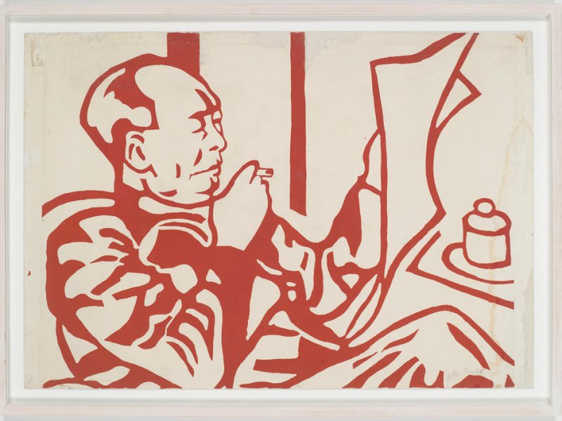 La silhouette stylisée mais reconnaissable de Mao Zedong se projette en rouge sur le fond blanc réservé de la toile, saisi dans une occupation bien triviale, fumant une cigarette et lisant son journal.