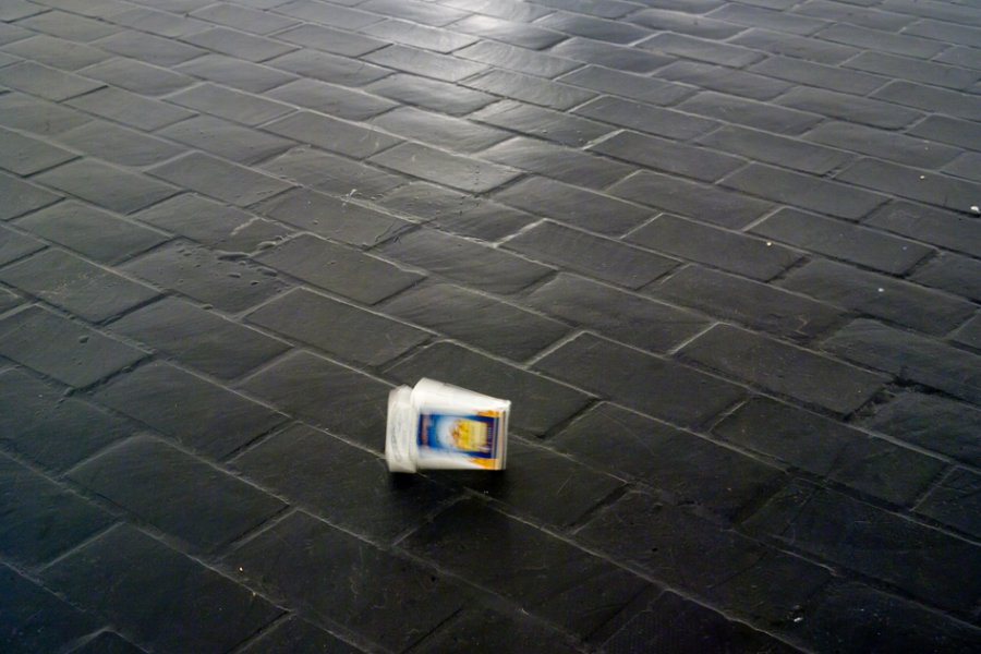 Comme emporté dans un courant d’air tourbillonnant, l’objet léger volette dans les airs d’une des plus majestueuses salles du Palazzo Grassi. La trajectoire circulaire, mécanique, que suit ce paquet vide et froissé de Camel Lights révèle néanmoins au regard curieux la présence d’un bras motorisé accroché au plafond, qui mène la danse de cette installation.