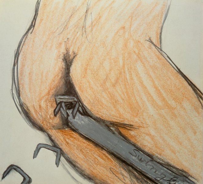Hors de tout contexte, une paire de fesses au dessin frénétique et volontairement grossier occupe toute la composition, représentée en train de rejeter les agrafes qu’une agrafeuse au large manche lui a introduites.