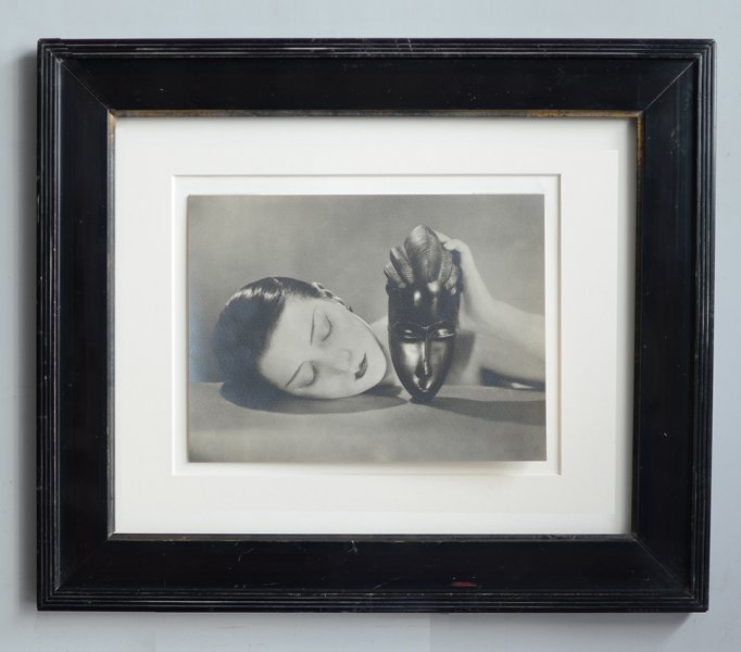 Plongée dans un cadre abstrait, une femme aux yeux clos, le visage couché, tient à ses côtés un masque africain aux traits féminins. Un jeu d’échos formels associe à la beauté célèbre de Kiki de Montparnasse celle, plastique, d’un masque-portrait « ndoma » de la culture baoulé en actuelle Côte d’Ivoire. Le noir et blanc contrasté du tirage photographique redouble la dichotomie qui oppose et rapproche les deux modèles, telle qu’elle est soulignée dans son titre.