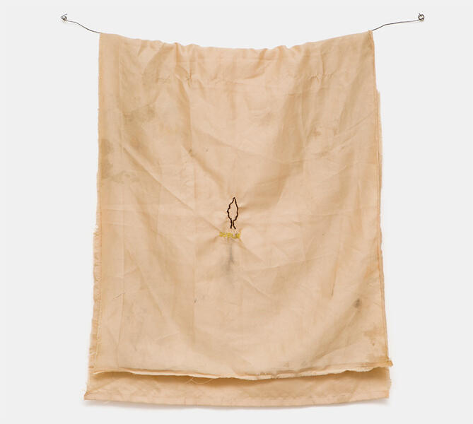 Au cours de l’un de ses voyages à travers l'Afrique de l'Ouest, Paulo Nazareth a trouvé un morceau de tissu usé, qu’il a décidé de conserver. L'artiste a brodé sur cet objet délaissé une silhouette ressemblant à un arbre ; en dessous, il a ajouté le mot "oublie".