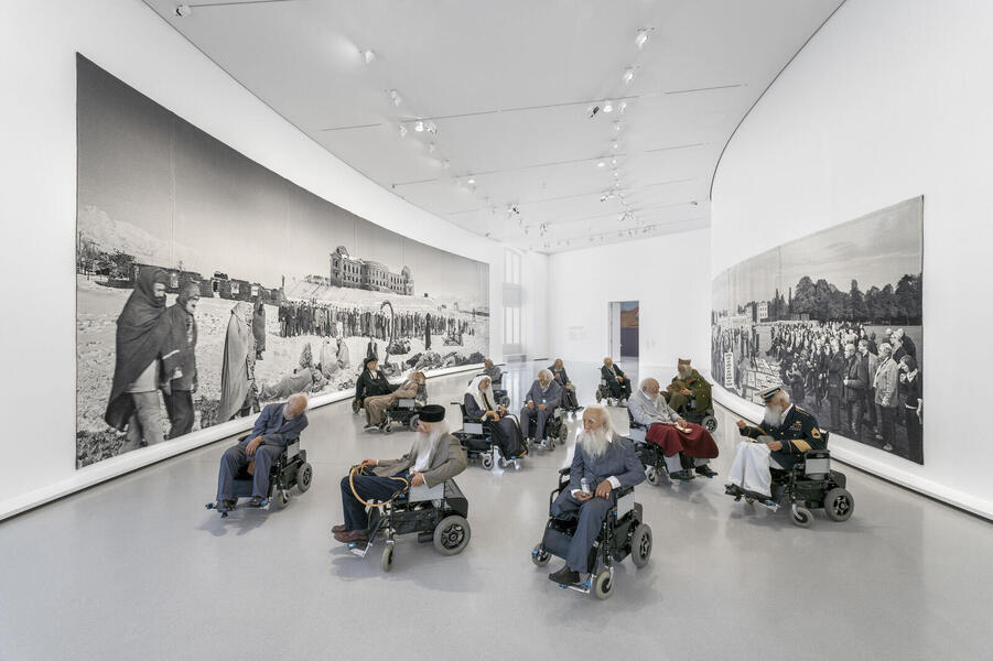 Treize figures hyperréalistes assises dans autant de fauteuils roulants se croisent et s’entrechoquent en l’absence de toute forme d’interaction. Passant au premier abord pour le simulacre grotesque d’une réunion de personnes âgées, apathiques ou simplement endormies, il s’avère que leurs traits et apparences reprennent fidèlement ceux de treize chefs d’État contemporains.