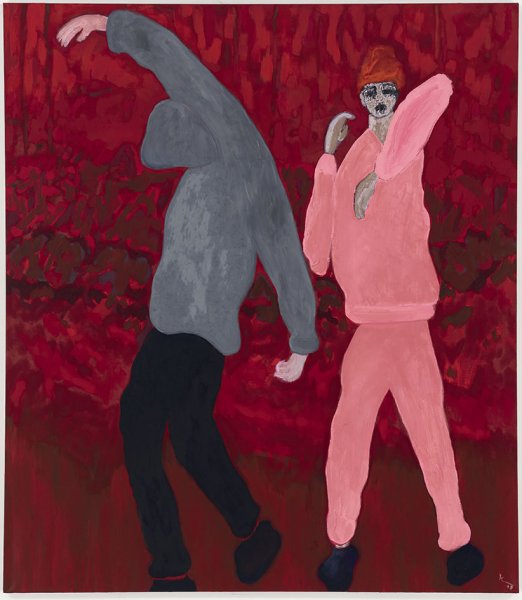 Sur un fond incandescent, deux jeunes hommes aux tenues street, sweat shirts à capuche et survêtements, figurées par des aplats de couleur pures -rose, noir et gris- sont représentés grandeur nature, bras levés, comme en mouvement, saisis dans d'étranges poses qui semblent désarticulées. Le personnage en gris danse-t-il ? Lance-t-il un projectile ? Son camarade, aux mouvements de breaker, se protège-t-il du coude ou improvise-t-il une démo ? Entre danse urbaine et lutte, l'ambiance semble surchauffée.