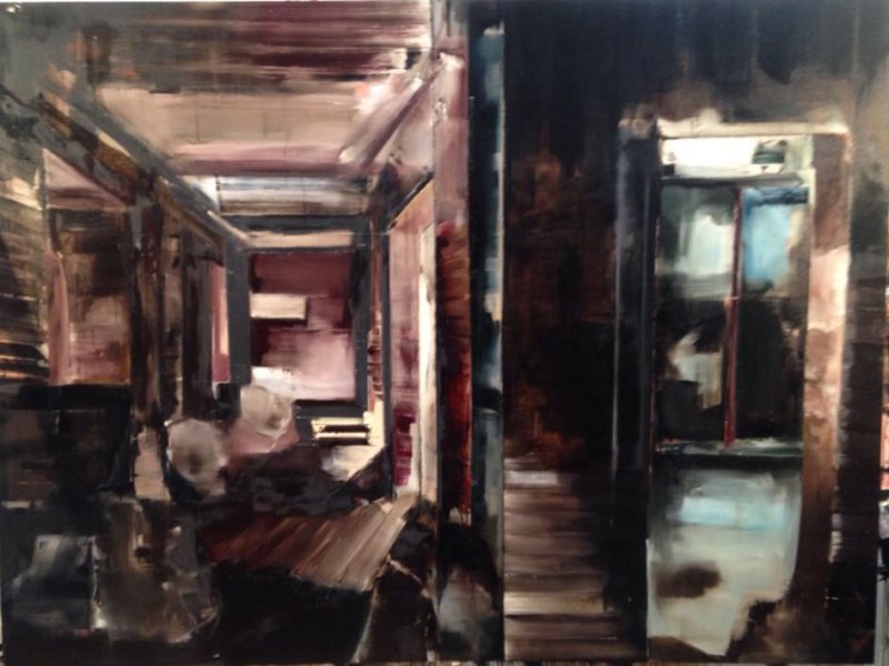 Le diptyque Sans titre est issu de la série Appartement peinte par Elliot Dubail en 2018. Née de photographies qu’il a prises dans l’appartement en cendres d’une collectionneuse qui avait acquis l’une de ses premières peintures, toutes les toiles issues de cette série sont des vues du bâtiment incendié. On distingue une architecture complexe, alors que les couleurs sont appliquées dans des gestes vifs et instinctifs, jouant avec la lumière comme si les toiles étaient éclairées à la bougie. A la fois calmes et inquiétants, et malgré l’absence apparente de vie, ces espaces semblent habités par une présence qu’on ne saurait décrire mais qui nous interroge. Se dégage de cette toile une atmosphère particulière, une énergie presque surnaturelle, comme le prolongement de l’artiste lui-même.