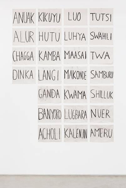 Anuak, Kikuyu, Luo, Tutsi… sobrement inscrits au charbon sur du papier journal, les vingt-cinq mots accumulés au mur déclinent les noms de vingt-cinq ethnies du sud-est de l’Afrique ayant subi un génocide.