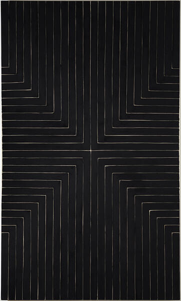 Toile brillante de très grand format recouverte d’émail noir et striée de rayures, Stella Die Fahne Hoch! reproduit une œuvre originale de Frank Stella, Die Fahne Hoch! dont le titre reprend celui de l’hymne national de l’Allemagne nazi. Elle est, à date, l’une des premières productions minimalistes de l’époque.