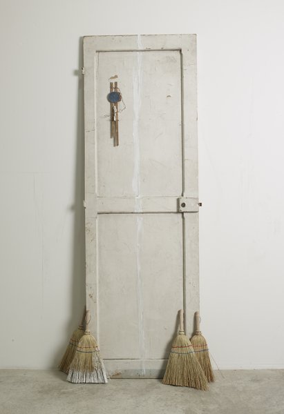 Totem d’objets quotidiens assemblés entre eux – une porte blanche, quatre têtes de balais et un carillon – l’installation intitulée Talismán semble posséder des vertus magiques, un pouvoir de protection. Elle renferme autant de secrets, d’histoires passées sous silence, qu’elle incarne la possibilité d’ouverture sur des futurs possibles.