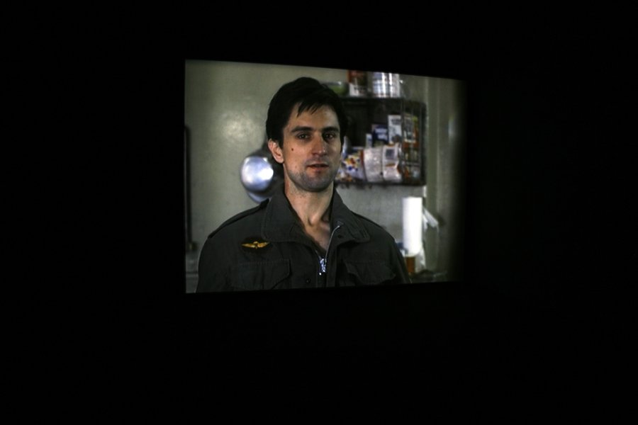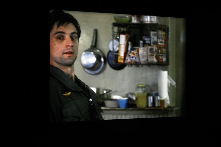 Dans Through a Looking Glass, Douglas Gordon reprend une scène mythique du film de Martin Scorsese, Taxi Driver, dans laquelle l’acteur Robert De Niro s’adresse à son miroir. Douglas Gordon place deux écrans diffusant cet extrait face-à-face. Le premier extrait est diffusé à vitesse normale, le second est inversé et légèrement ralenti. En rendant visible les éléments de la syntaxe filmique, il analyse et annule la dimension narrative du film.