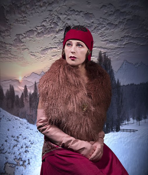 Une femme assise soutient son regard au loin, le visage de trois-quarts, affublée d’une tenue au charme désuet, associant chapeau en cloche, boa de poils, robe satinée et gants fourreaux, qui l’associe alors au temps des Années folles. Le paysage alpin artificiel en arrière-plan perce à jour le simulacre historiciste.