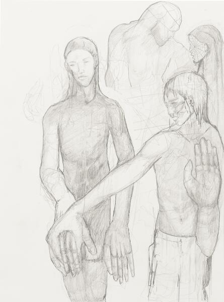 Dans ces cinq dessins, ce ne sont pas tant les visages que les corps — et en particulier les mains et les doigts surdimensionnés — qui retiennent notre attention. Par des jeux de lumière, d’ombre et de surfaces inachevées, Imhof fait émerger des figures spectrales aux gestes suspendus, en attente de mouvement. Ces silhouettes fragiles et inquiétantes évoquent des danses lentes et silencieuses, annonçant les chorégraphies intenses et crépusculaires de l’artiste. Étirés ou contorsionnés, ces corps rappellent les études anatomiques de Géricault et incarnent chez Imhof une tension constante entre vie et mort.