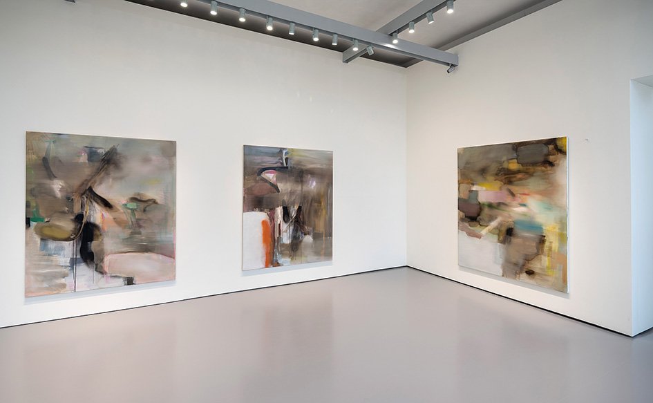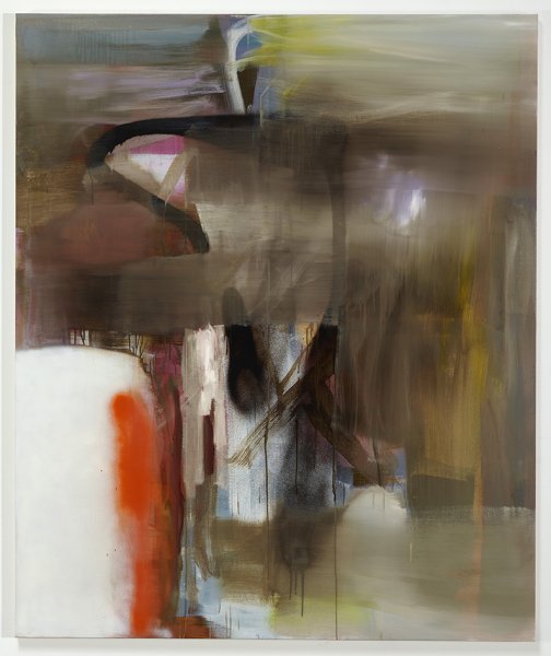 De vifs traits de pinceau blancs, gris, marron et jaunes se superposent, se croisent et se confondent à la surface du grand tableau Untitled. La matière picturale sature l’espace de la toile en même temps qu’elle laisse transparaître par endroits ces nombreuses couches successives.
