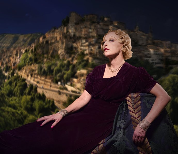 Le portrait photographique Untitled 2016 pourrait sortir tout droit d’une revue de mode ou de cinéma des années 1920 tant la tenue et la coiffure de la poseuse ainsi que le sofa sur lequel elle s’accoude correspondent à l’imaginaire visuel de cette époque. Pourtant, la surréalité et l’incohérence de l’arrière-plan, figurant un village perché méditerranéen découpé sur un fond métallique abstrait, déconstruit volontairement l’écran de ce simulacre.