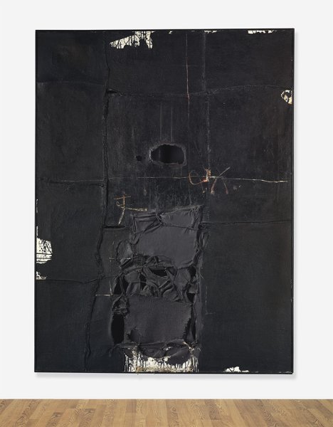 La grande toile Untitled (Composition) Painting no. 4 est presque entièrement recouverte d’une peinture noire opaque, laissant entrapercevoir de rares éclaircies. Des trous béants la lacèrent en son milieu, pour certains recouverts en partie de morceaux de toile grossiers.