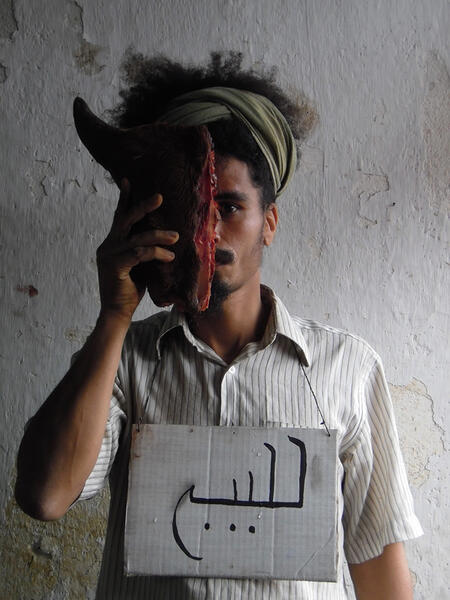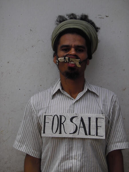 Diptyque loufoque et provocateur, ces photographies sans titre issues de la série Para Venda mettent en scène Paulo Nazareth tantôt la mâchoire inférieure d’un petit animal fixée sur sa bouche, tantôt camouflé derrière la tête coupée d’un animal. Affublé d’un morceau de carton sur lequel il a inscrit « À vendre », ses autoportraits vacillent entre humour, revendications politiques et questionnements identitaires.
